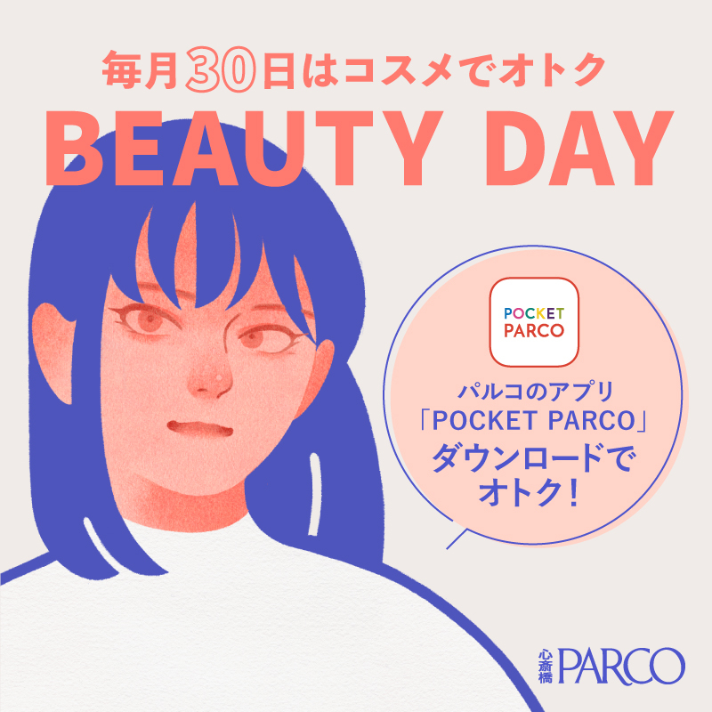 毎月30日に対象ショップにてコスメ・ビューティ関連商品を、キャッシュレス決済で税込5,000円(レシート合算可)お買上げ毎に、心斎橋PARCOお買物券(500円)を進呈します。