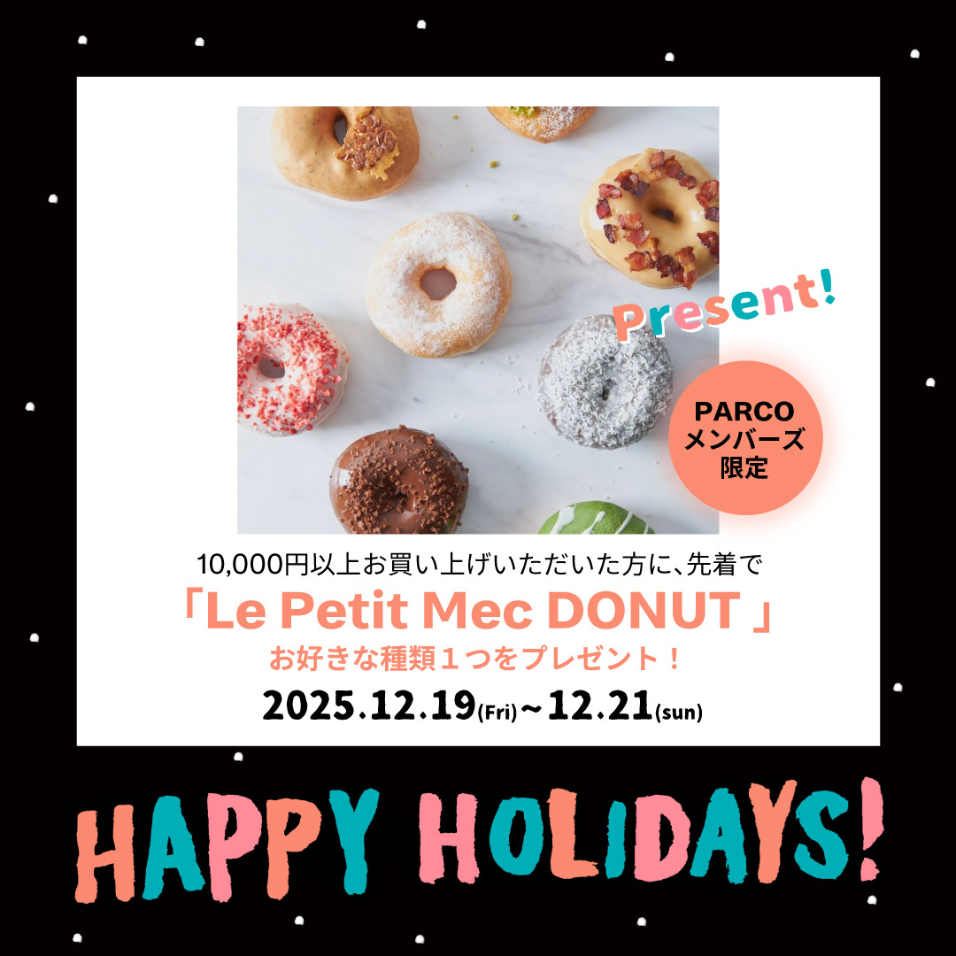 館内にて税込10,000円(期間中・複数ショップ合算可) お買上げいただいた、PARCOメンバーズの方に先着で「Le Petit Mec DONUT 」お好きな種類1つをプレゼント!