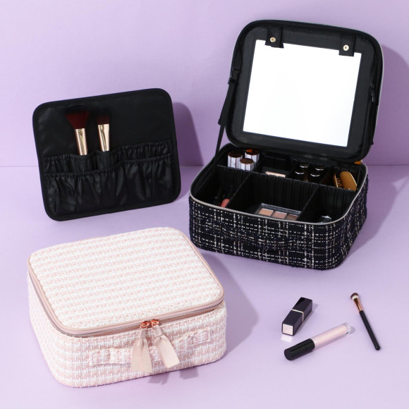 角度調整可能なミラーや取り外しが可能なブラシ立て、お好きな位置にカスタマイズできる仕切りなど、便利な仕様を詰め込んだメイク特化型のバニティメイクバッグです。バッグをそのままドレッサーとしてお使いいただけるので旅行などのおでかけにもおすすめです。