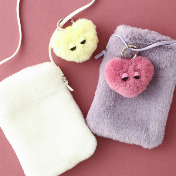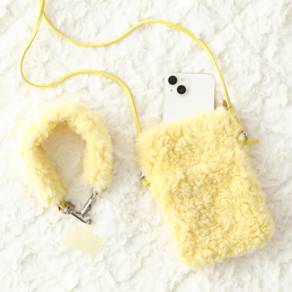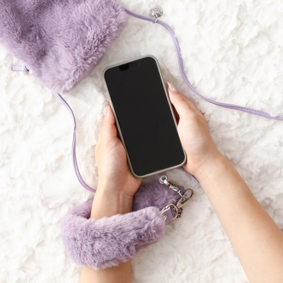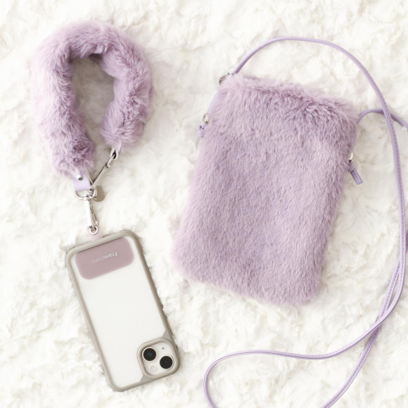 トレンドカラーのファー素材を使用したスマホショルダーバッグとスマホハンドストラップ。