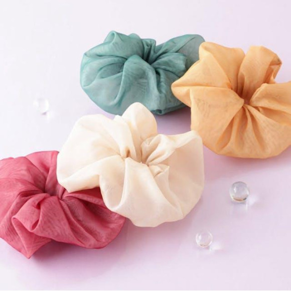 落ち着いたカラーで透け感のある素材と大きめサイズが可愛らしいシュシュです。
