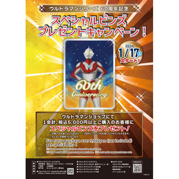 ウルトラマンショップでは1月17日(土)より、ウルトラマンシリーズ60周年を記念したスペシャルピンズプレゼントキャンペーンがスタート!