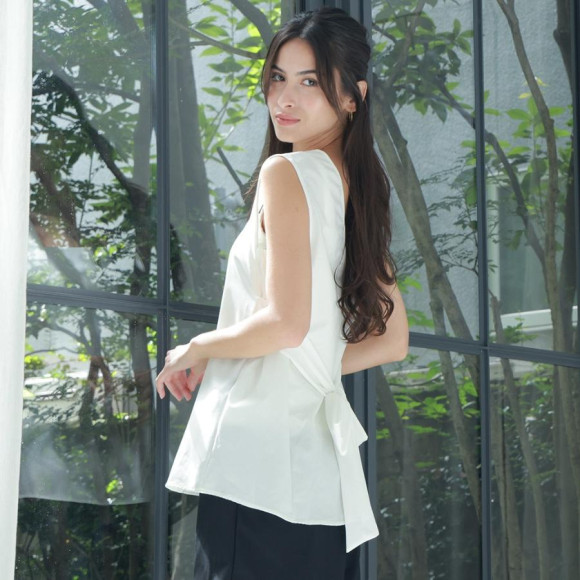 サイドのウエスト部分からリボンが結べるデザインになっているのでスッキリ細見え効果も◎