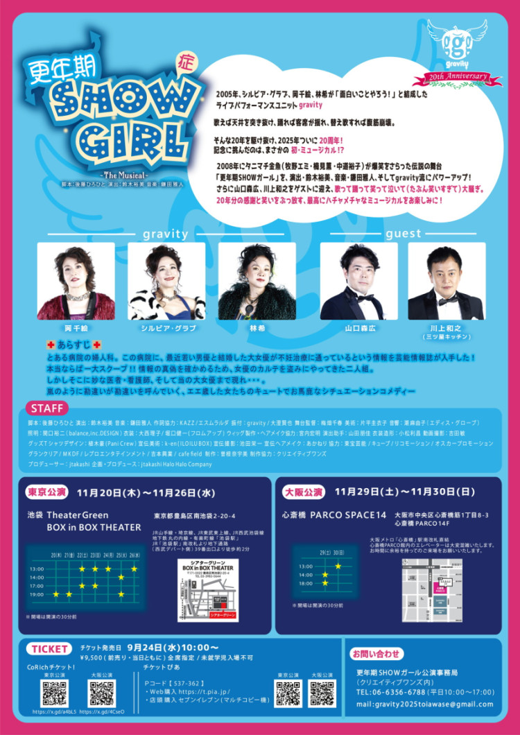 「更年期SHOWガール」を、演出・鈴木裕美、音楽・鎌田雅人、そしてgravity流にパワーアップ!さらに山口森広、川上和之をゲストに迎え、歌って踊って笑って泣いて(たぶん笑いすぎて)大騒ぎ。
